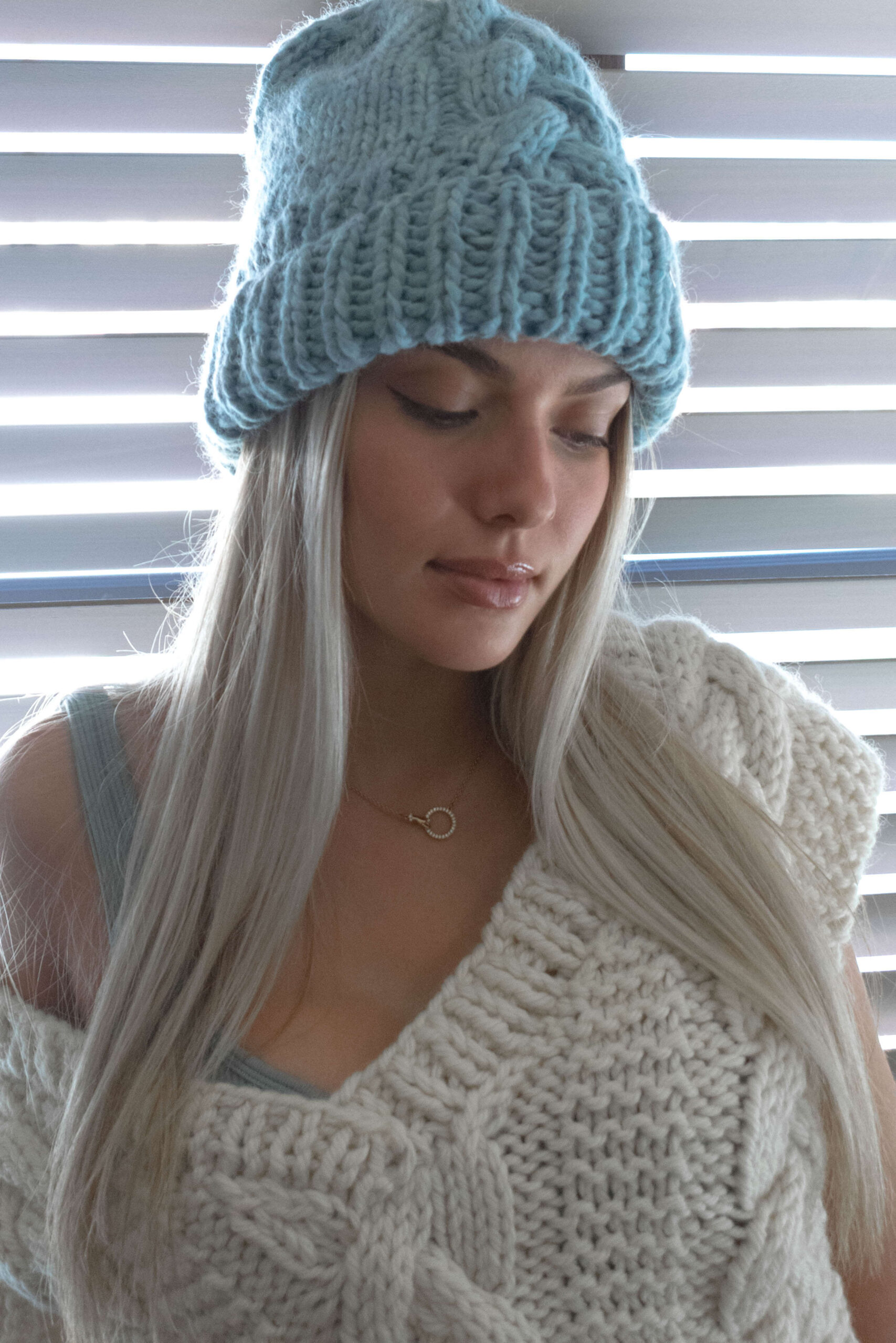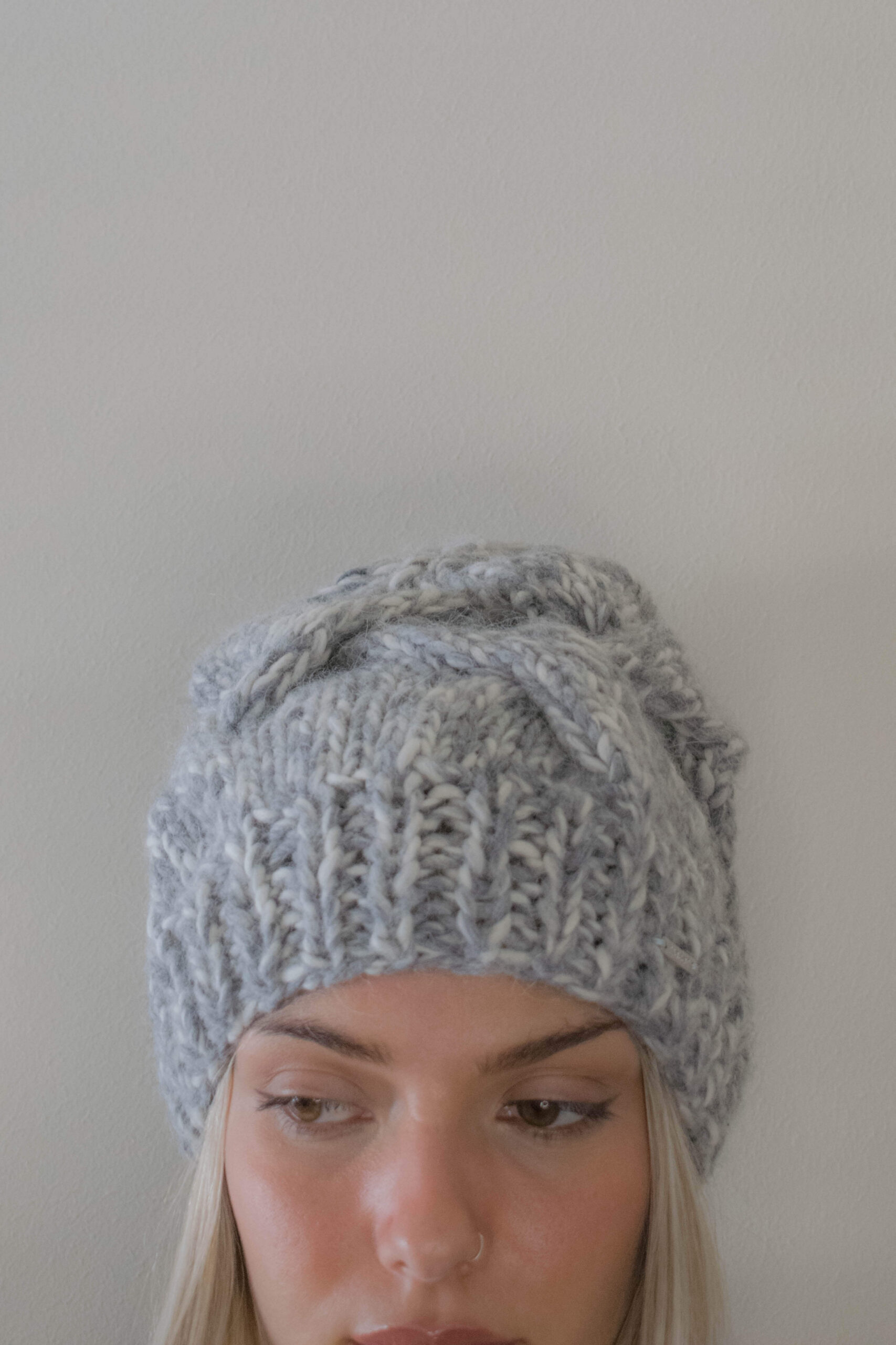 This Beanie is entirely hand-knitted and comes in two colorways with a a different detail each. The light blue, has a 3D chain that runs vertically on the front and folds at the edge. The white/grey, has multiple intertwined 3D chains that go all the way around. Both are finished with a ribbed hem to make the edge more stretchy and give them a cleaner look. The use of this specific yarn in combination with the chosen weave makes it ideal to keep your ears and head warm. The perfect company to your outdoor winter activities, it will keep you warm no matter what! Inside and stitched by hand is our Trecot woven label. A metal label is stiched on front.