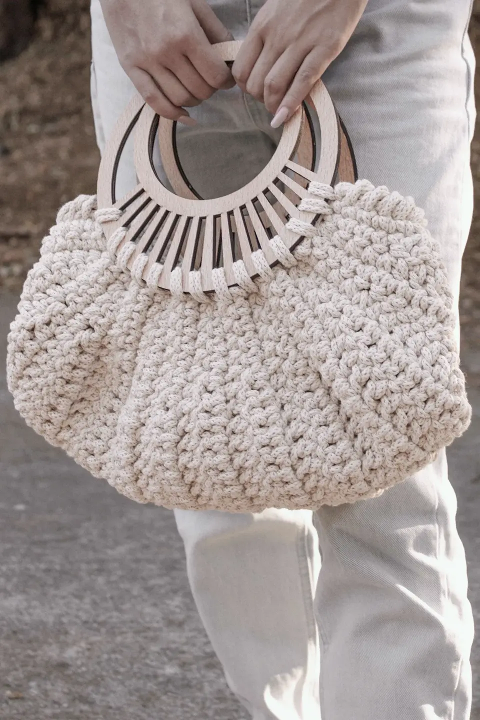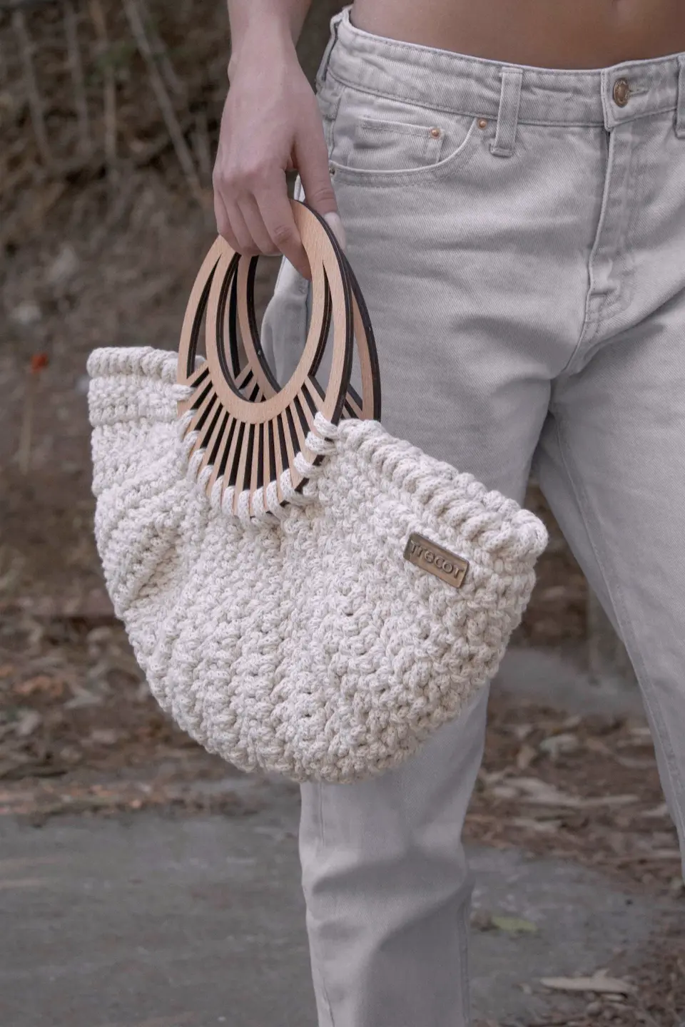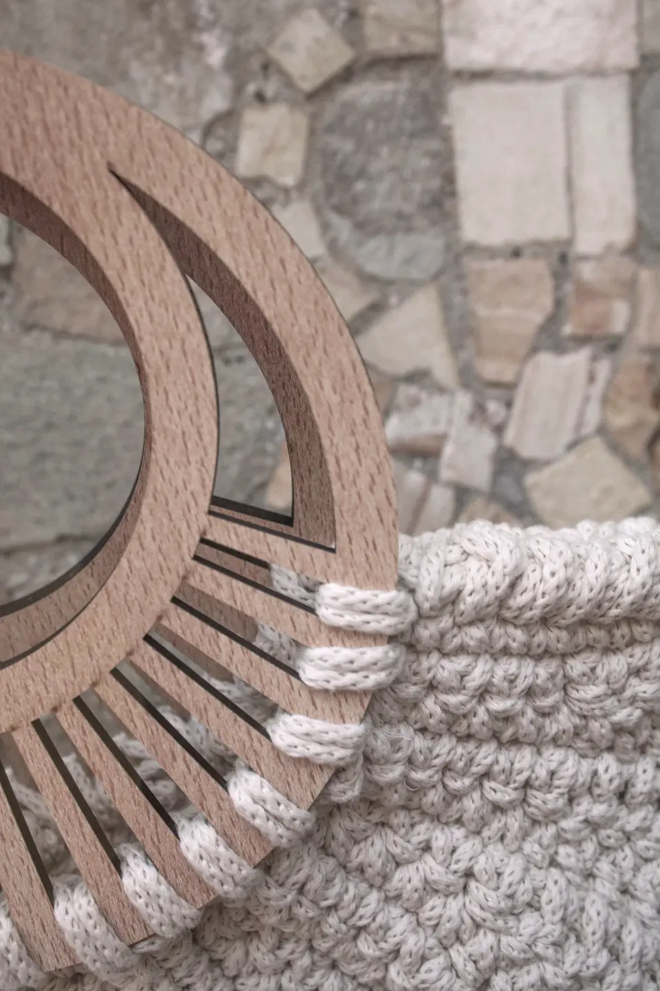 Inspired by seashells this beautifully structured Coquille bag has a steady hand-knitted body in beige that is held by two rounded wooden handles. Inside and stitched by hand is our Trecot woven label and a metal one is placed on front. The ends can be pushed on the inside to get a totally different style!