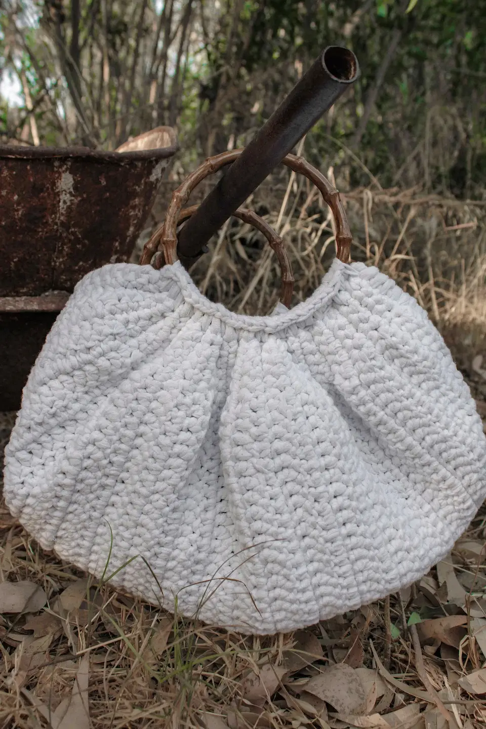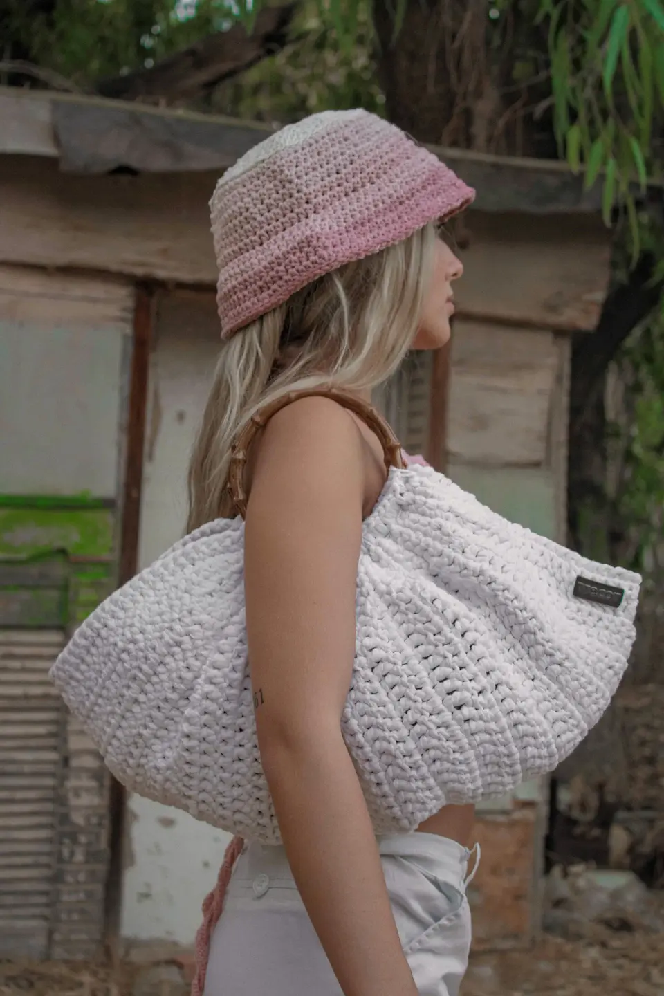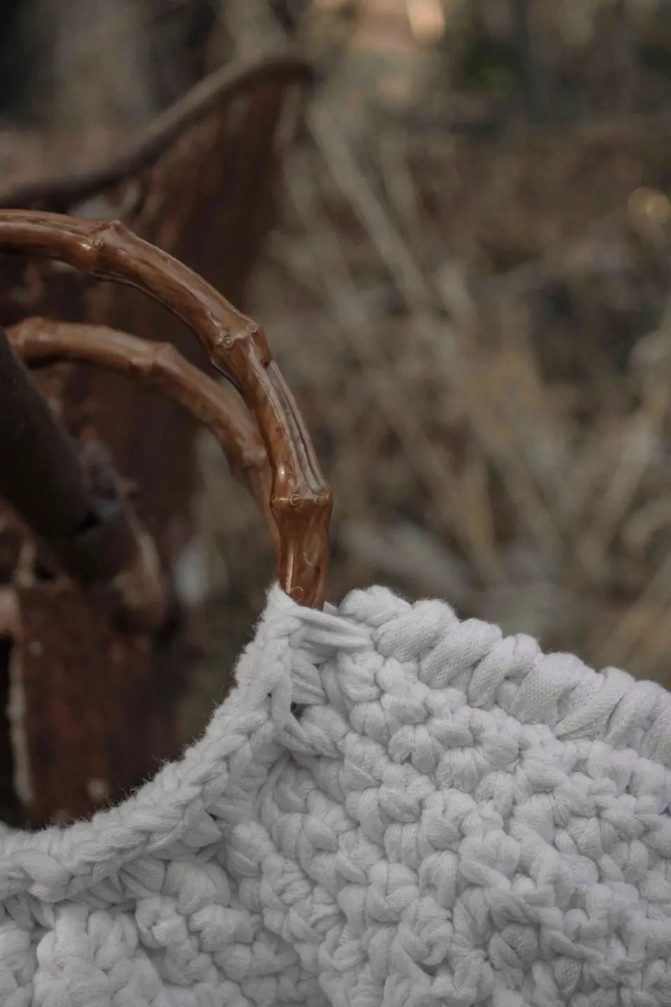 Inspired by seashells this beautiful Coquille bag has a soft hand-knitted body in white that is held by two rounded bamboo handles. Inside and stitched by hand is our Trecot woven label and a metal one is placed on front. The ends can be pushed on the inside to get a totally different style!