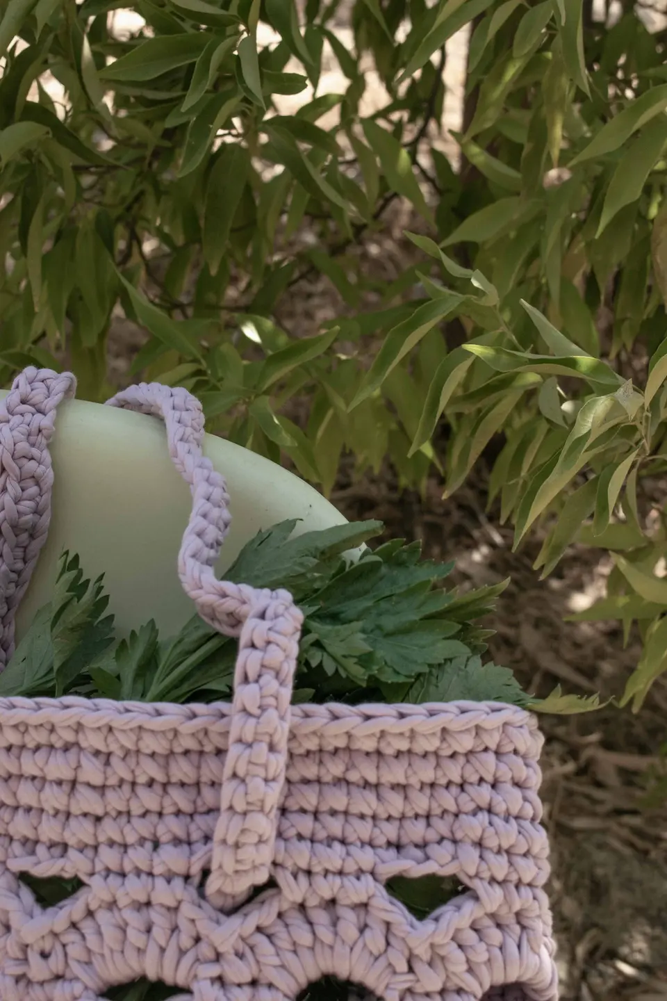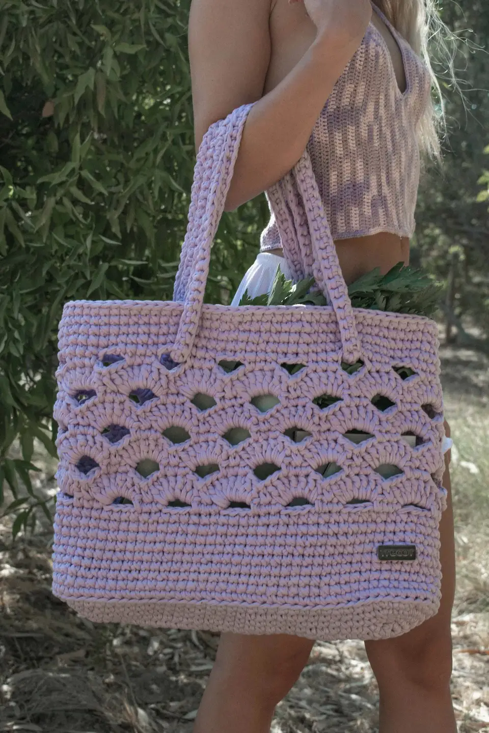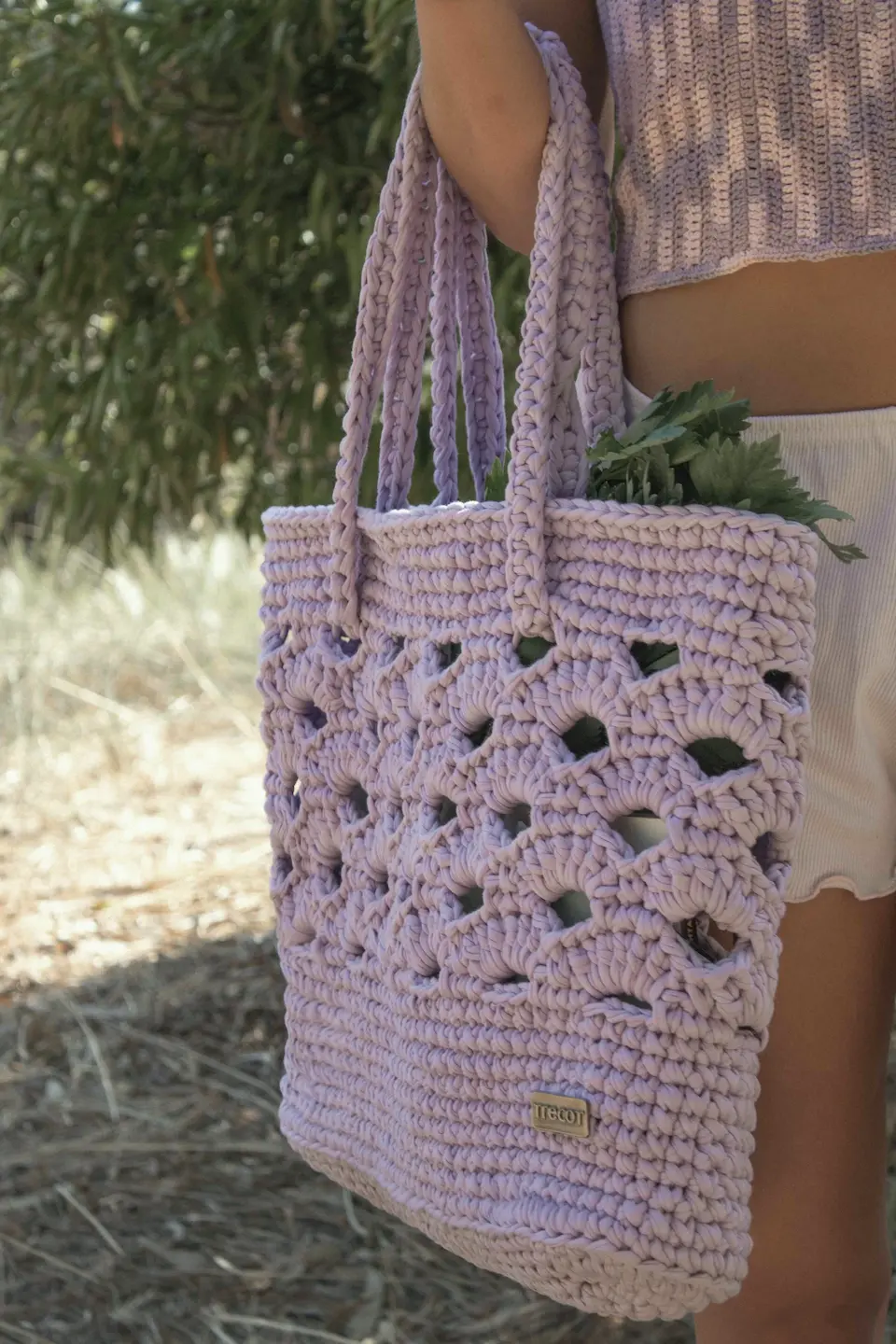 The lovely rattan inspired bag in lilac is entirely hand-knitted. It has our Trecot hand stitched woven label inside and a metal one placed outside. The two straps can change to give you some variation in the way it can be worn. The yarn used to make this bag makes it very steady. Our Rattan bag fits all the essentials and so much more! Slip inside a tablecloth, good food, a refreshing drink, find a nice spot and enjoy your day!