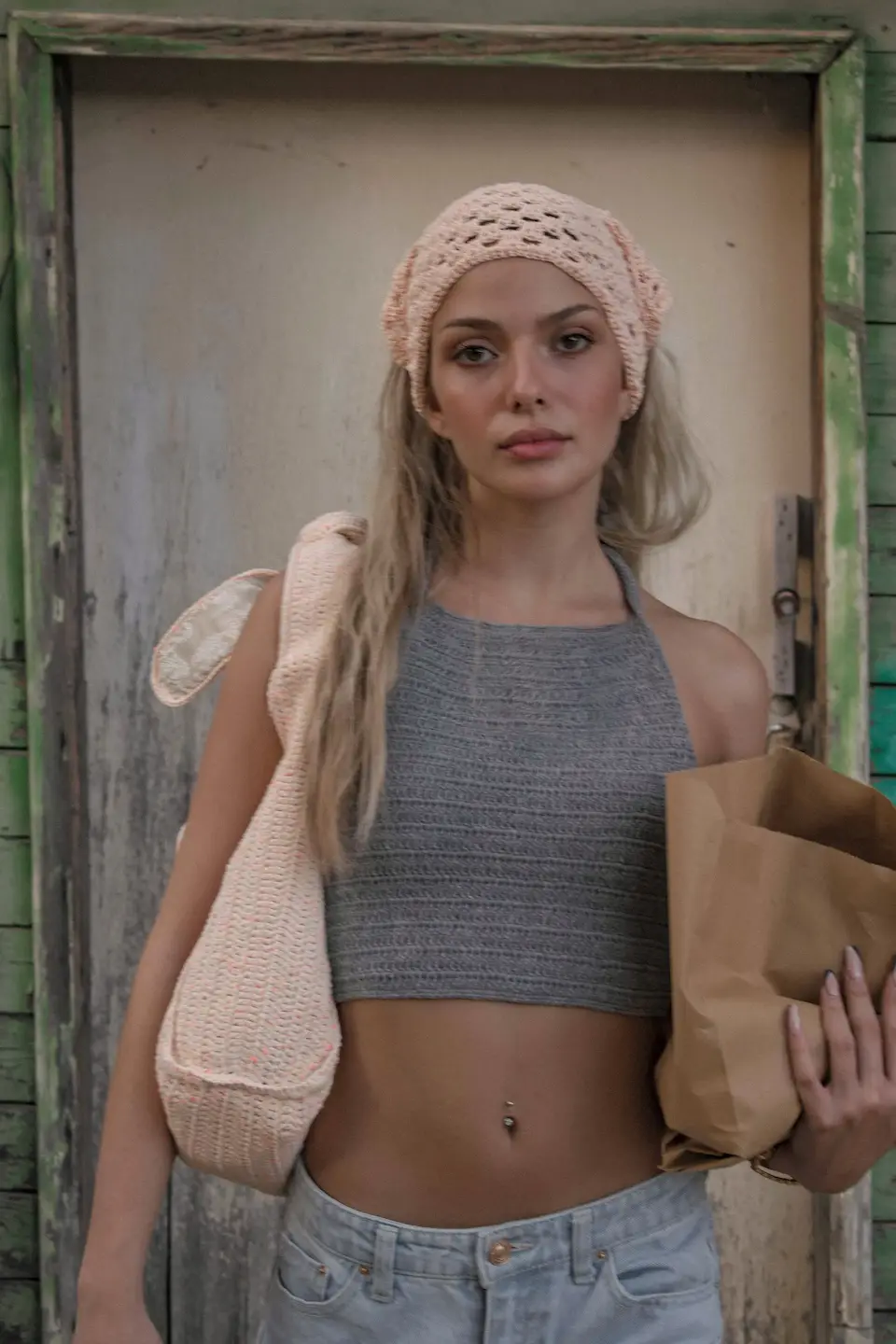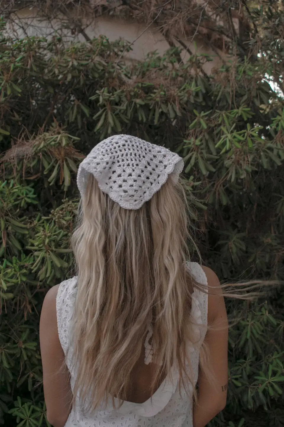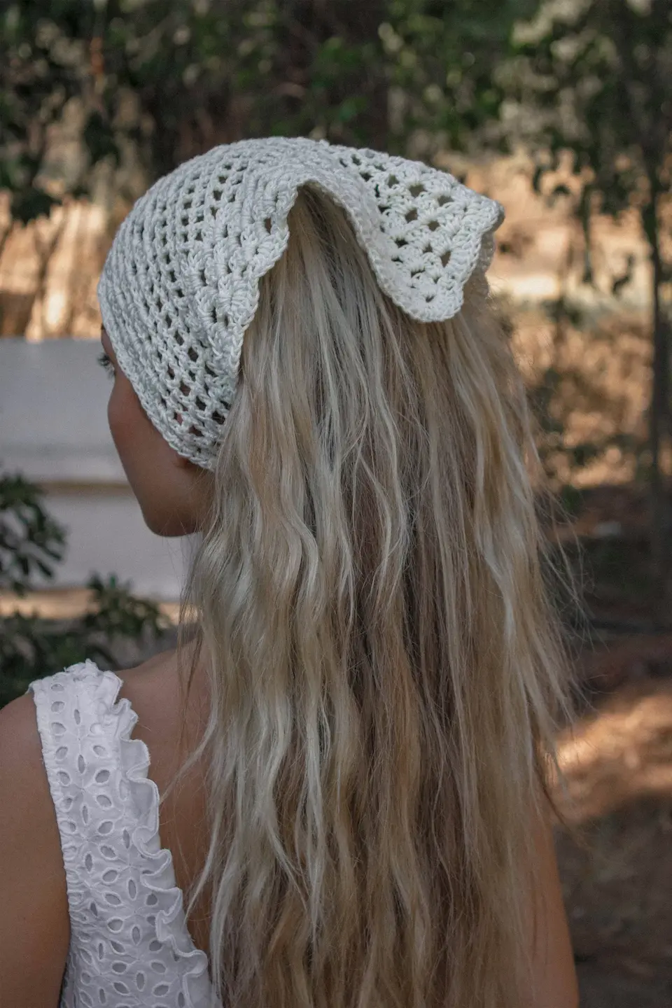 Our rattan inspired and hand-knitted bandana, ties along the back with two delicately knitted straps that curl up at the ends. Inside and stitched by hand it has our Trecot woven label.